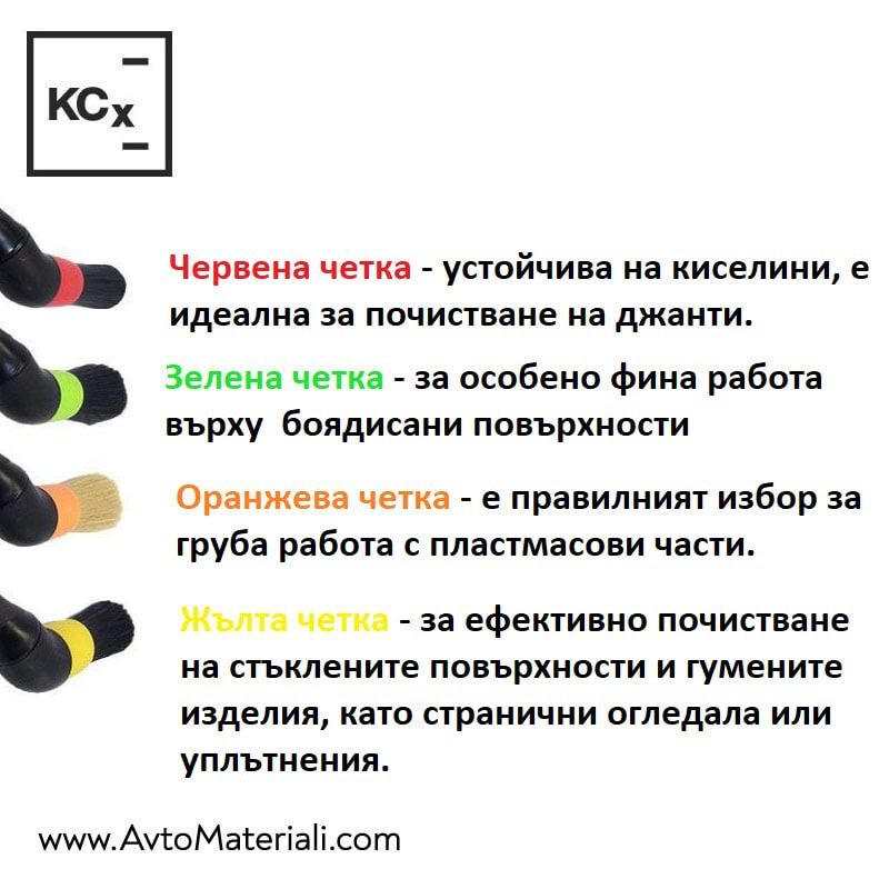 Зелена четка - за особено фина работа върху чувствителни боядисани повърхности, като хром или пиано лак,  благодарение на особено фините си косъмчета